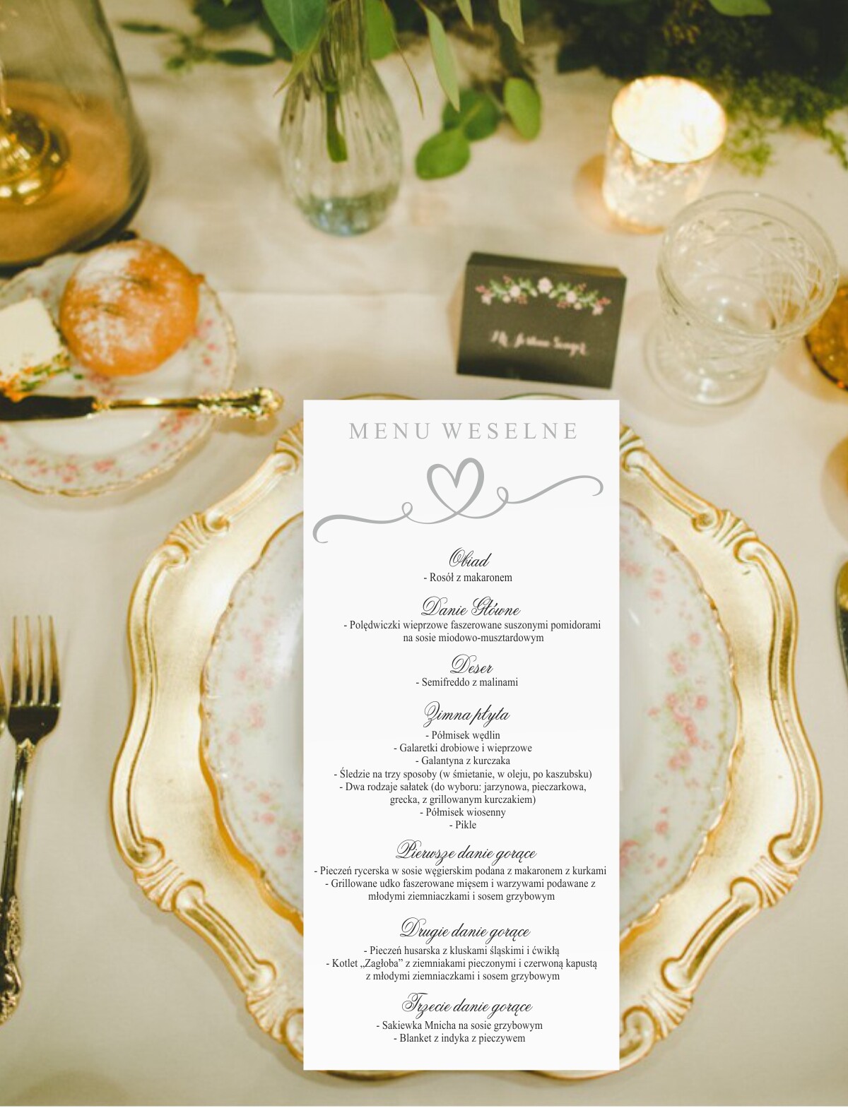 Menu możesz położyć przy każdym talerzyku. Karta dań to elegancka i praktyczna prezentacja potraw, która wzbogaci aranżacje weselną. Przygotuje również gości na potrawy, które lubią najbardziej a jest to dość istotna cecha w sytuacji kiedy podczas imprezy dzieję się naprawdę dużo. Uniwersalny rozmiar DL zmieści najbardziej bogate menu.