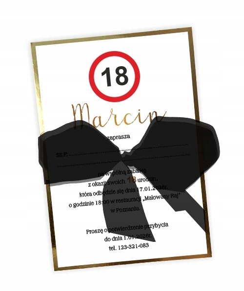Zaproszenia urodzinowe ze znakiem 18 oraz z czarną kokardą to absolutna klasyka, która balansuje między nowoczesnym minimalizmem a luksusową elegancją. Ten detal potrafi całkowicie odmienić charakter papeterii, nadając jej sznytu "black tie". Nasz model Golden Hour nawiązuje do charakterystycznego znaku "18" (często stylizowanego na znak drogowy ograniczenia prędkości).