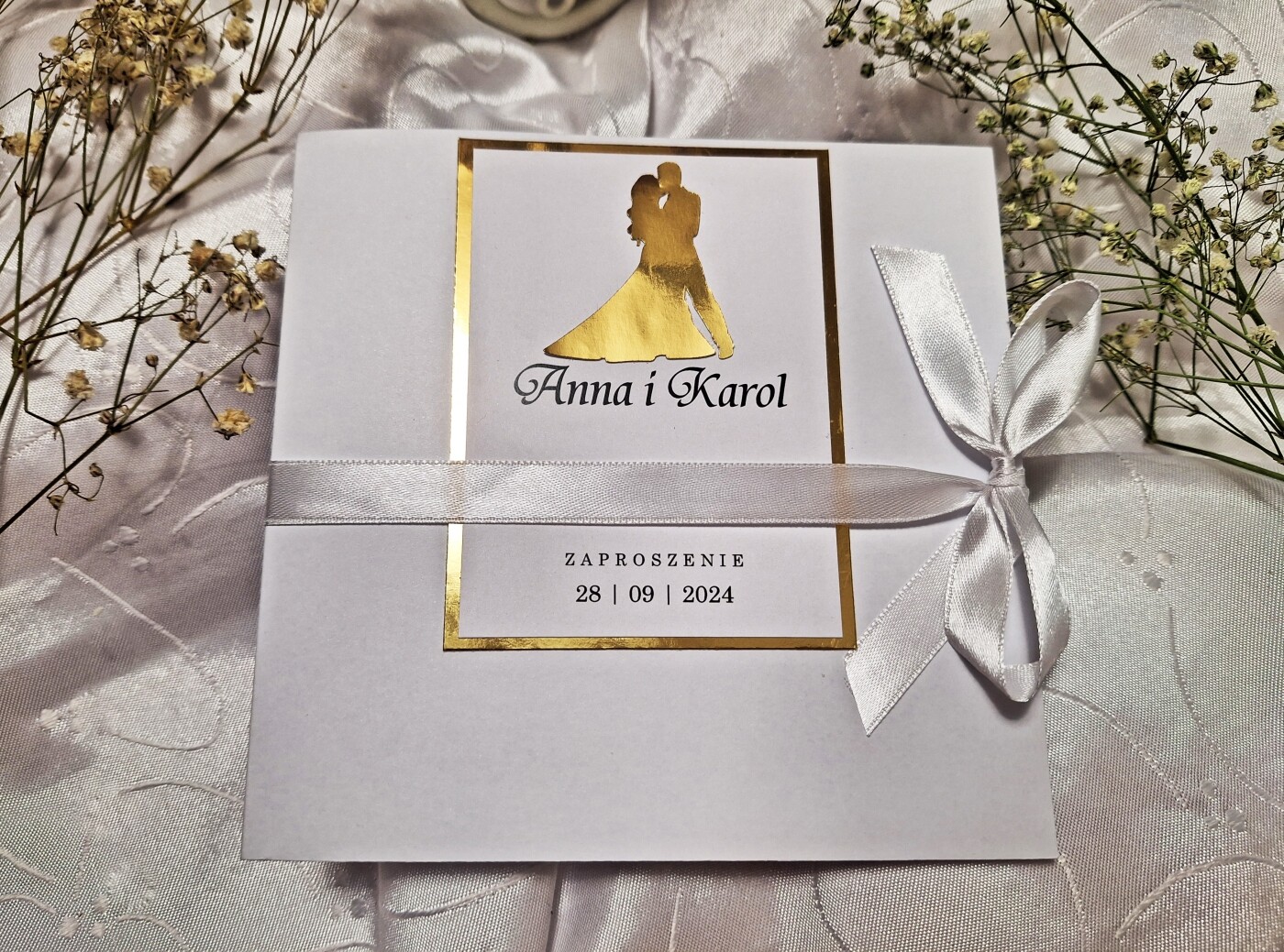 Oferta dotyczy zaproszeń ślubnych z postacią Pary Młodej w kolorze złotym. Model w formacie 14,6 x 14,6 w stylu glamour. Bardzo nowoczesny a jednocześnie elegancki z białą kokardą. Zaproszenia bez wątpienia pasować będą do każdej aranżacji weselnej, tej bogatej w kwiaty lub prostej i minimalistycznej. Jeśli uwielbiacie proste a jednoczenie nieszablonowe wzory ten jest w sam raz dla Was!.