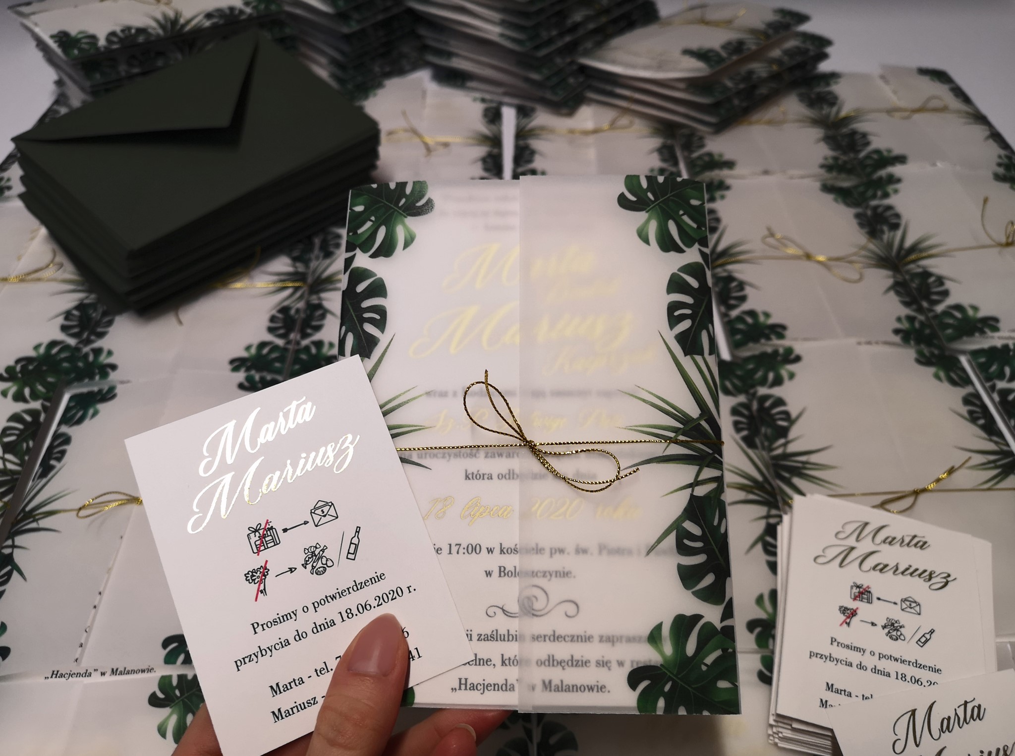 Przezroczyste zaproszenia ślubne z kalką w liście monstery. Gustowny model ze złoceniem lub bez. Zaproszenia zawierają karteczkę RSVP oraz złoty sznureczek. Oferta dotyczy zaproszeń wykonanych na kształt etui. Środkowa część jest delikatnie podklejona przezroczystym klejem. Dla osób szukających czegoś bardziej kolorowego - kwiecistego zaproponowaliśmy drugą wersję z kwiatami (patrz niżej).
